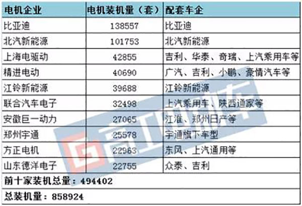 根據(jù)數(shù)據(jù)顯示,2017年電機(jī)裝機(jī)量排行前十名的企業(yè)有比亞迪、北汽新能源、上海電驅(qū)動、精進(jìn)電動、江鈴新能源等企業(yè),占據(jù)總裝機(jī)量的57.56%。其中,整車企業(yè)有4家,裝機(jī)數(shù)量占比超過6成。具體數(shù)據(jù)如下: